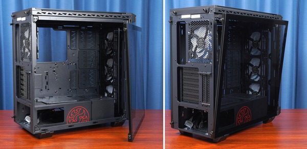 左右に装着された強化ガラス製ウィンドウパネルは背面のハンドスクリュー2つで固定されています。ハンドスクリューはパネルから脱落しない構造です。ハンドスクリューを解除してパネルを後方へスライドすると、下端をヒンジにしてパネルが15度程度外に開くので後は上に引き上げるだけで簡単に着脱できます。写真を見ての通り、下端のヒンジによってパネルはシャーシから脱落しないので、逆に取り付け時の位置合わせも簡単です。