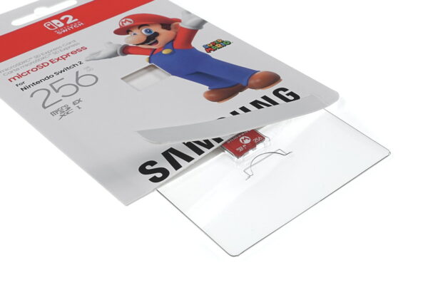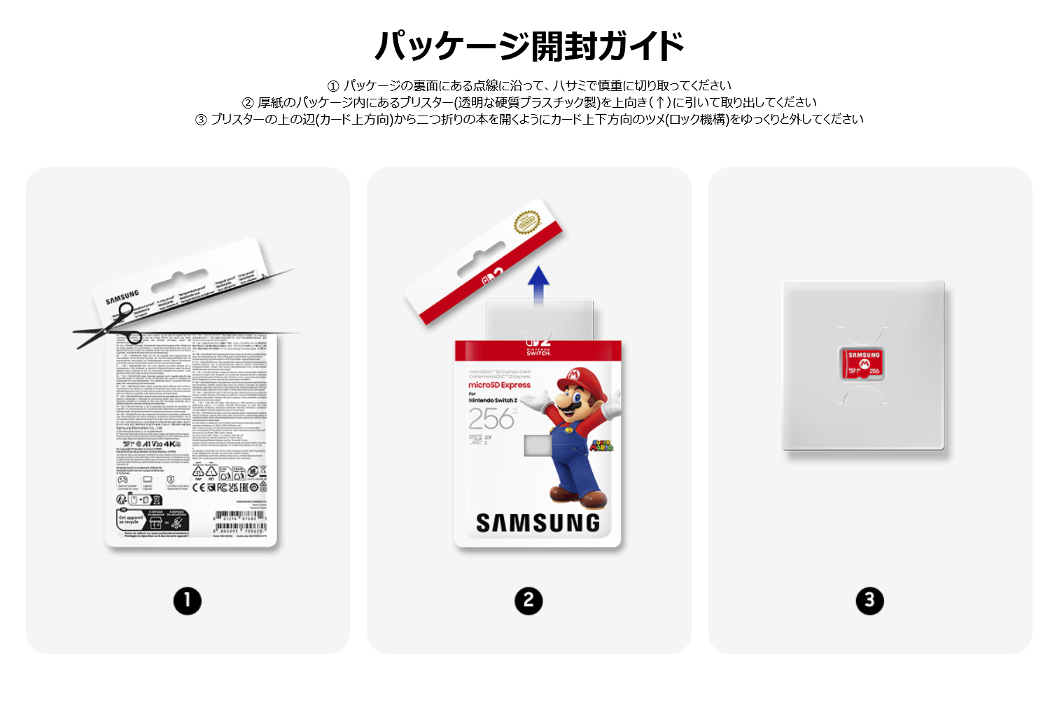 SanDisk/Samsungの任天堂ライセンス商品 microSD Expressカードはいずれも薄い紙製パッケージで梱包されていて、上端をハサミで切って開封します。