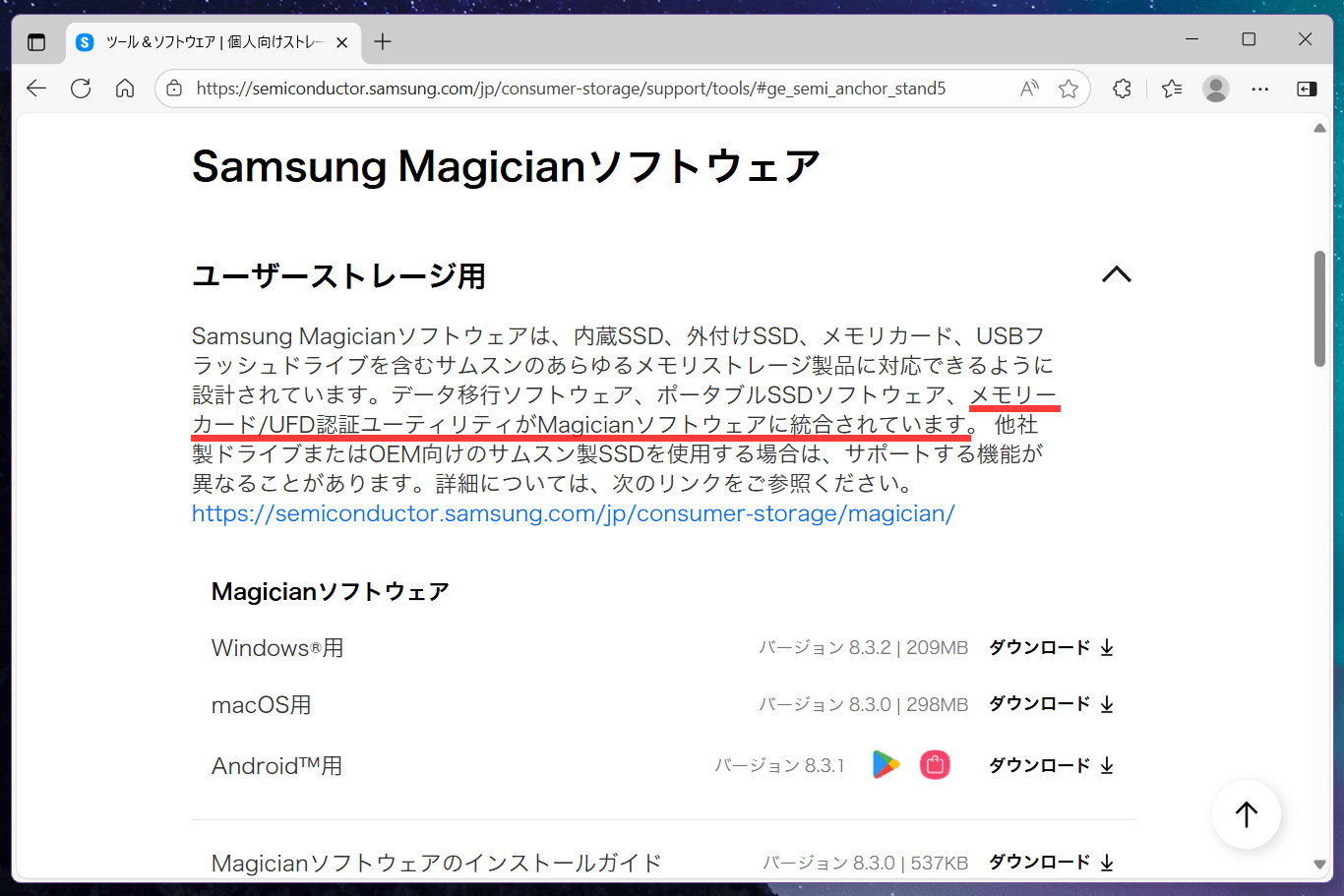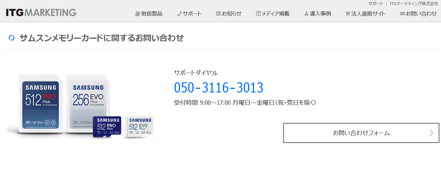 Samsungの製品ページにメモリーカードの保証規定に関するリンクがありますが、メモリーカードの問い合わせが記載されていません。