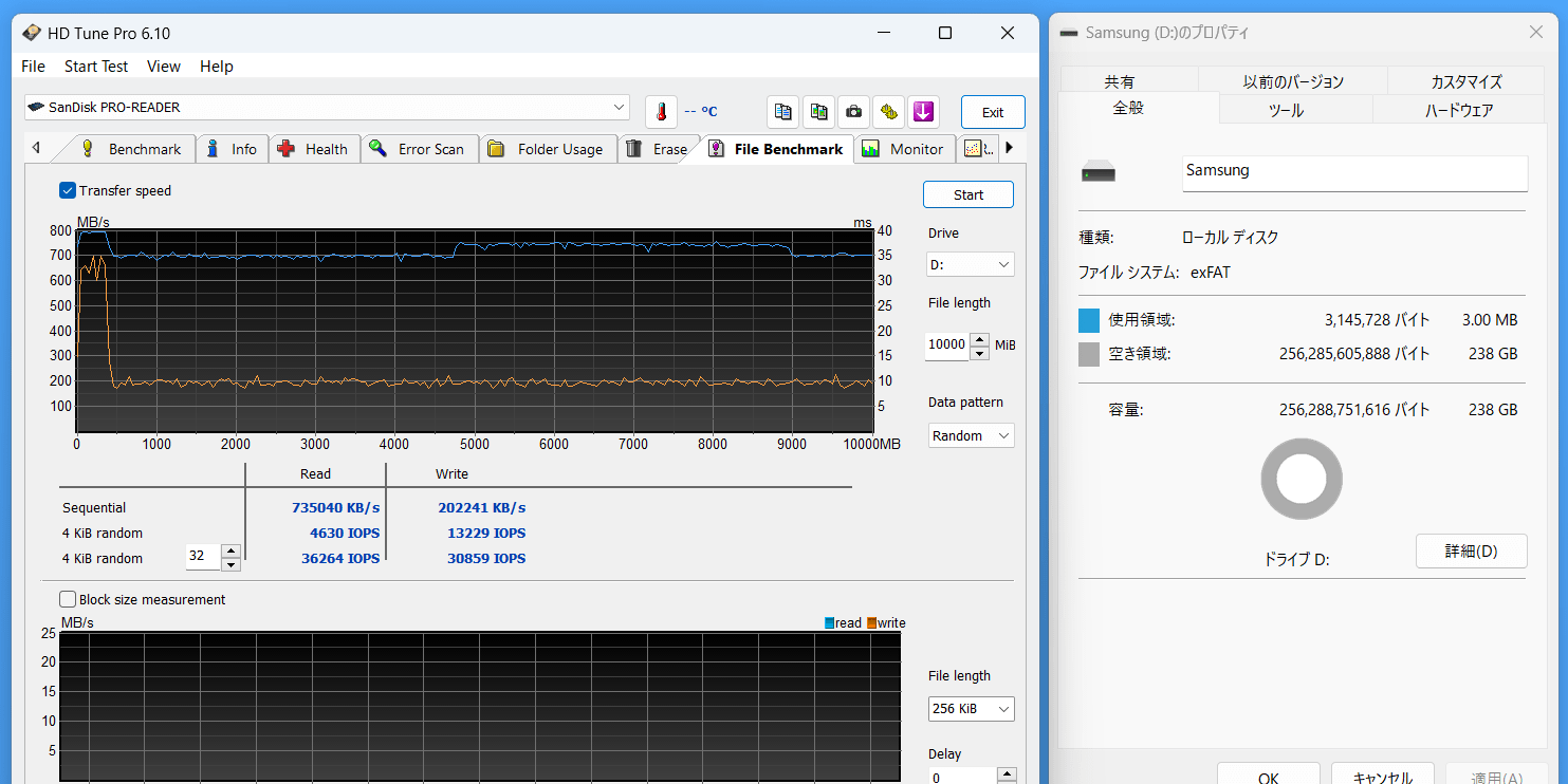 一方で、Samsung製はCDMベンチでも見たようにSLCキャッシュ外の読み出し性能が450MB/s程度と低く、実際のコピー読み出しでもSD Express(PCIE3.0x1)の理想的な速度よりも3割程度も低い性能です。