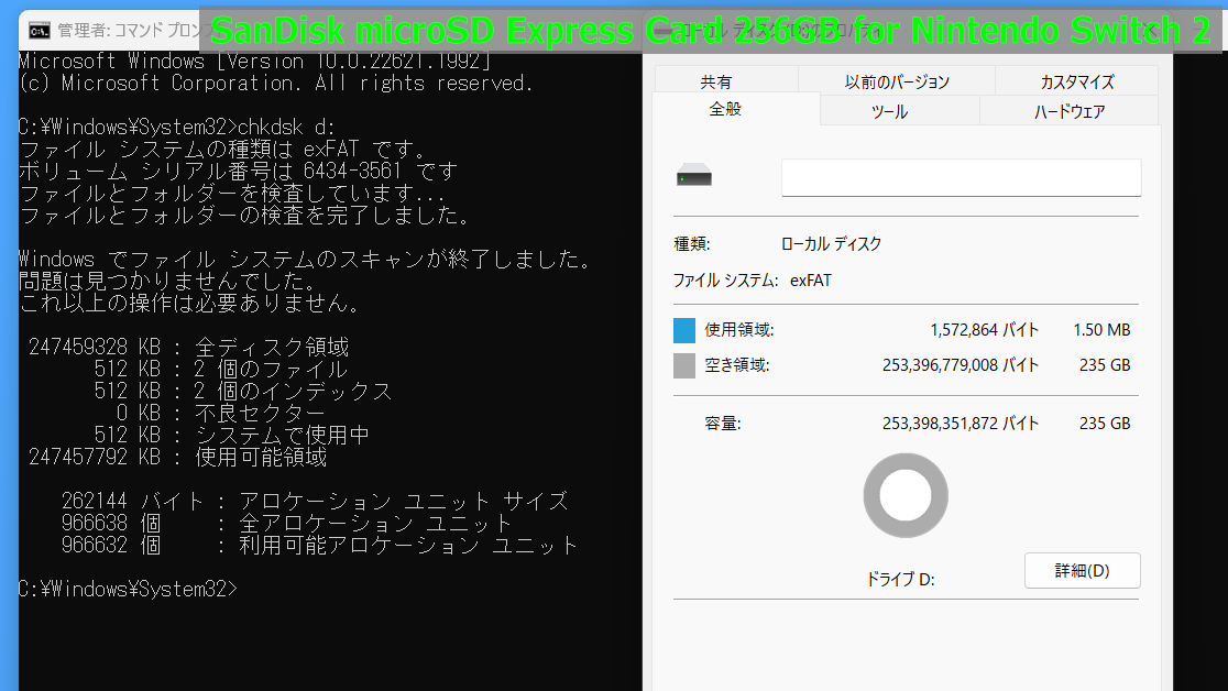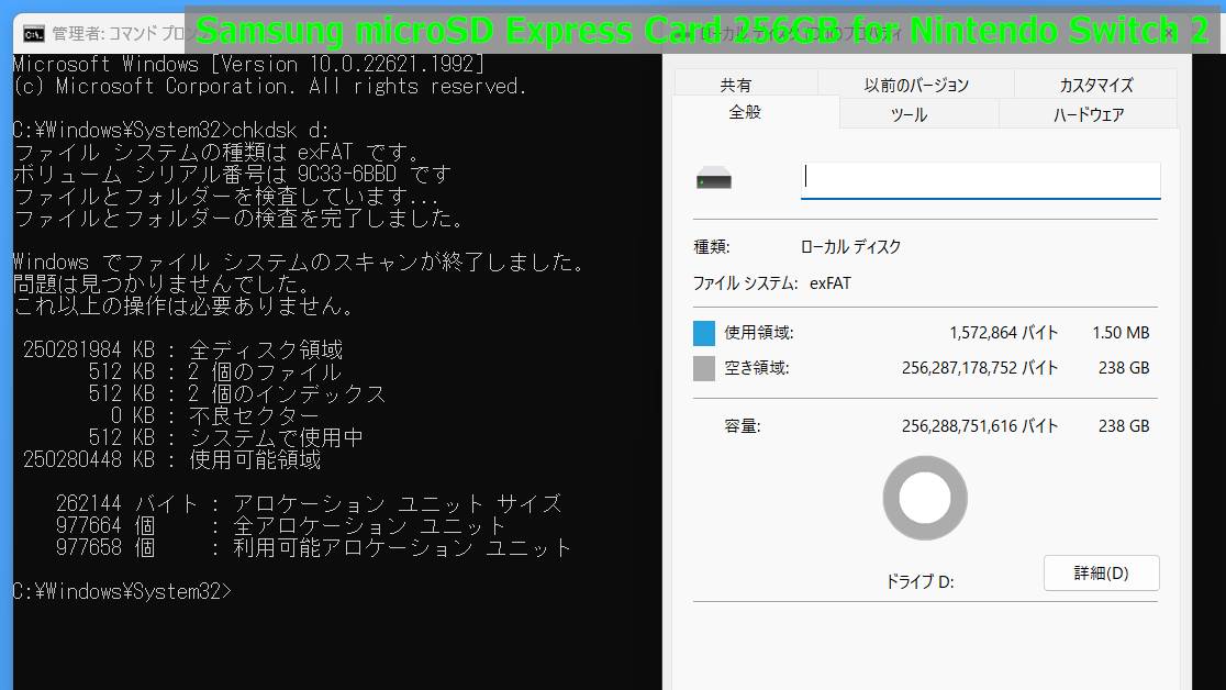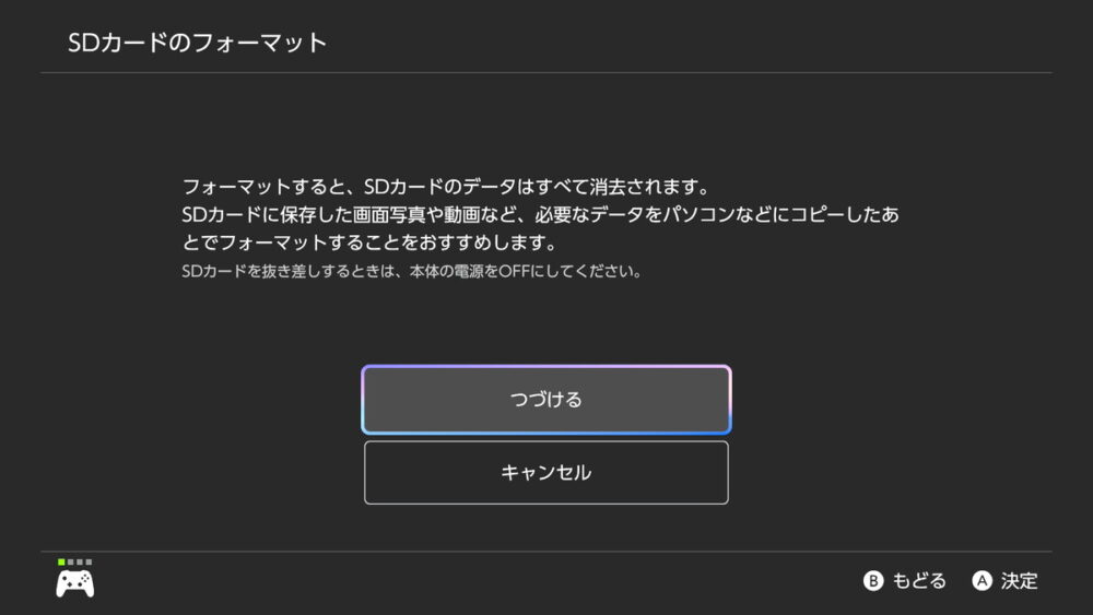 SD ExpressメモリーカードはexFAT形式であれば、Windows PCでフォーマットしてもNintendo Switch 2で使用できますが、今回の検証ではNintendo Switch 2の機能でフォーマットし直しています。