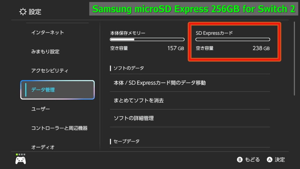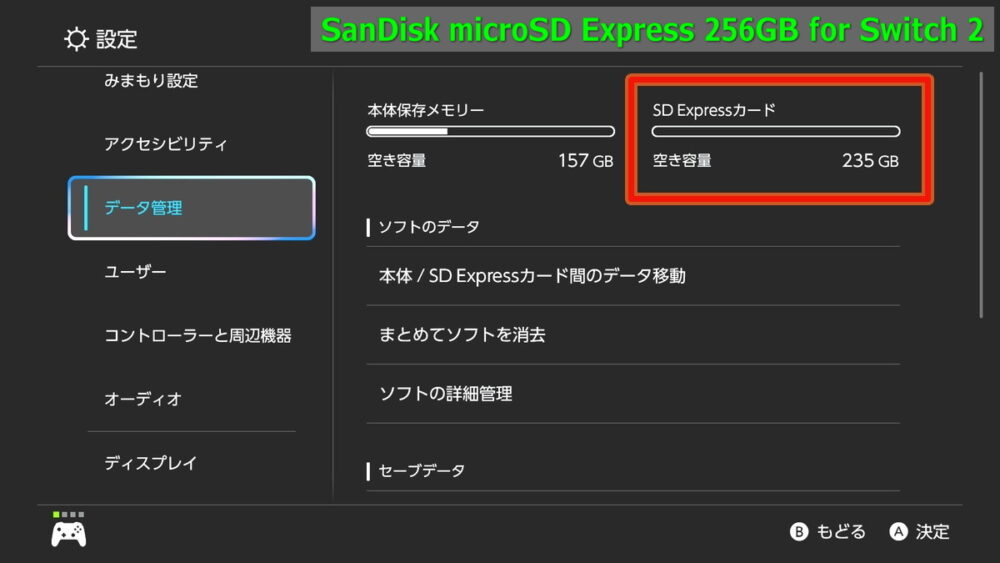 一番高速なSwitch 2の本体保存メモリーは、よく遊ぶゲームの保存先に使用したいので、画像・動画データやゲームバックアップで容量を圧迫されなくなるのは、SD Expressカードで保存領域を拡張するメリットです。