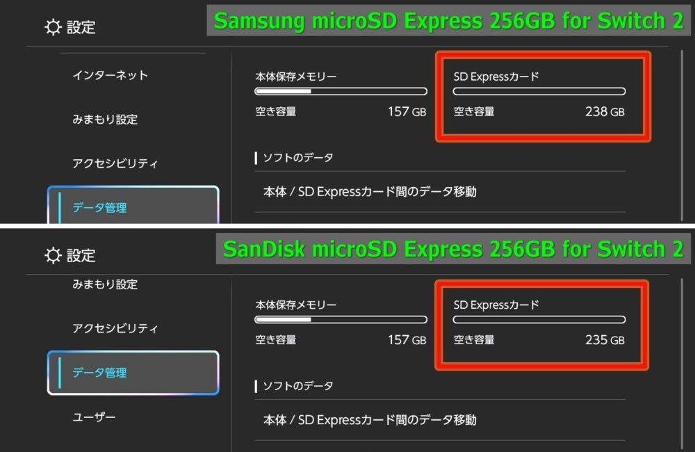 Switch 2において使用できる空き容量はSanDisk製が235GBに対して、Samsung製は238GBでした。