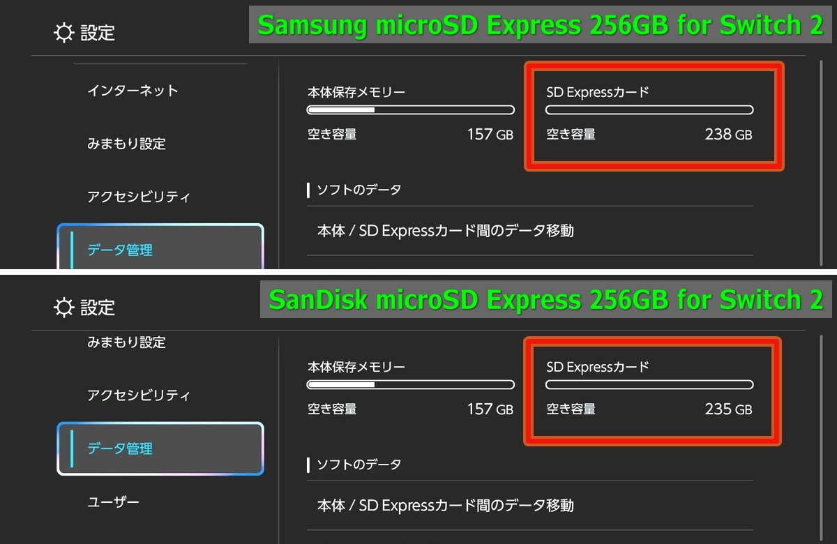 ゲーム1つ 20GB程度からすると小さい差ですが、Switch 2のキャプチャーボタンで撮影した動画・画像に換算すると、余分に3GBあれば動画 100個や画像 3000枚を追加で保存できるので、高速な本体保存メモリーを圧迫しないというSD Expressカードの役割的には地味に大きい差だと思います。