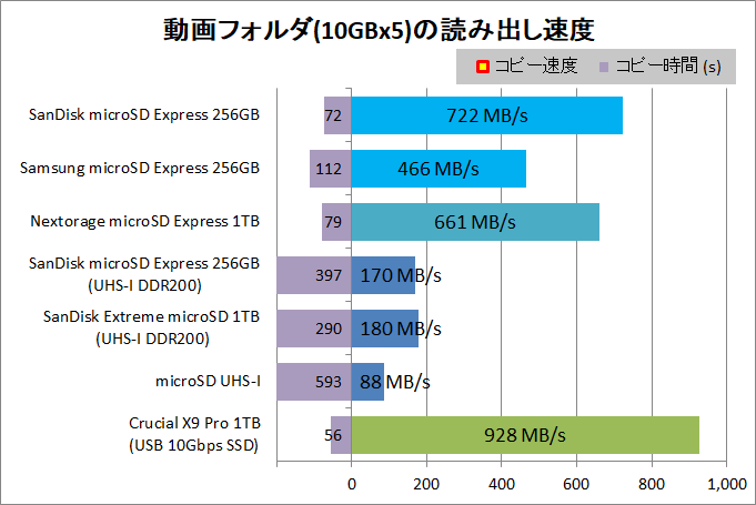 動画フォルダのコピー読み出しにおいて「SanDisk microSD Express Card 256GB for Nintendo Switch 2」によるコピー時間は72秒ほど、読み出し速度は722MB/s程度です。UHS-I環境と比較して8倍程度も高速になっており、SD Expressとして理想的な性能です。