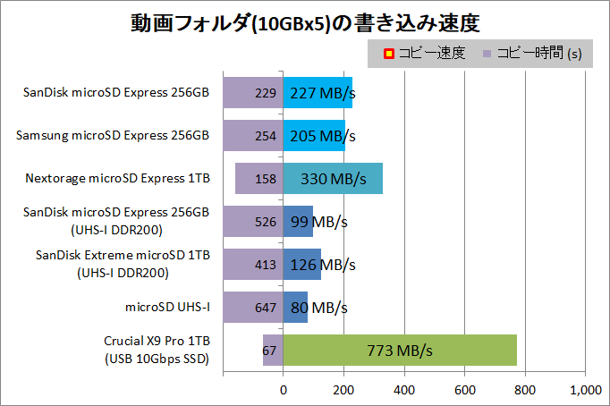 動画ファイルは1つ1つのファイルがGB単位の大容量なので実際のコピーではCrystalDiskMarkベンチマークでいうと連続読み出し・連続書き込み性能が重要になります。