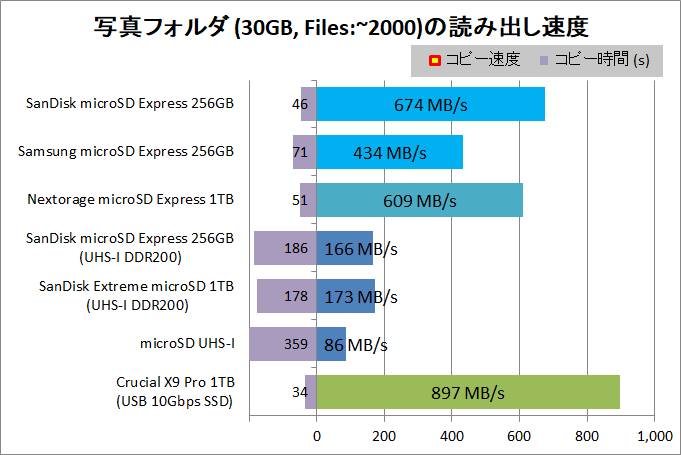 写真フォルダのコピー読み出しにおいて「SanDisk microSD Express Card 256GB for Nintendo Switch 2」によるコピー時間は46秒ほど、読み出し速度は674MB/s程度です。UHS-I環境と比較して8倍程度も高速になっており、SD Expressとして理想的な性能です。
