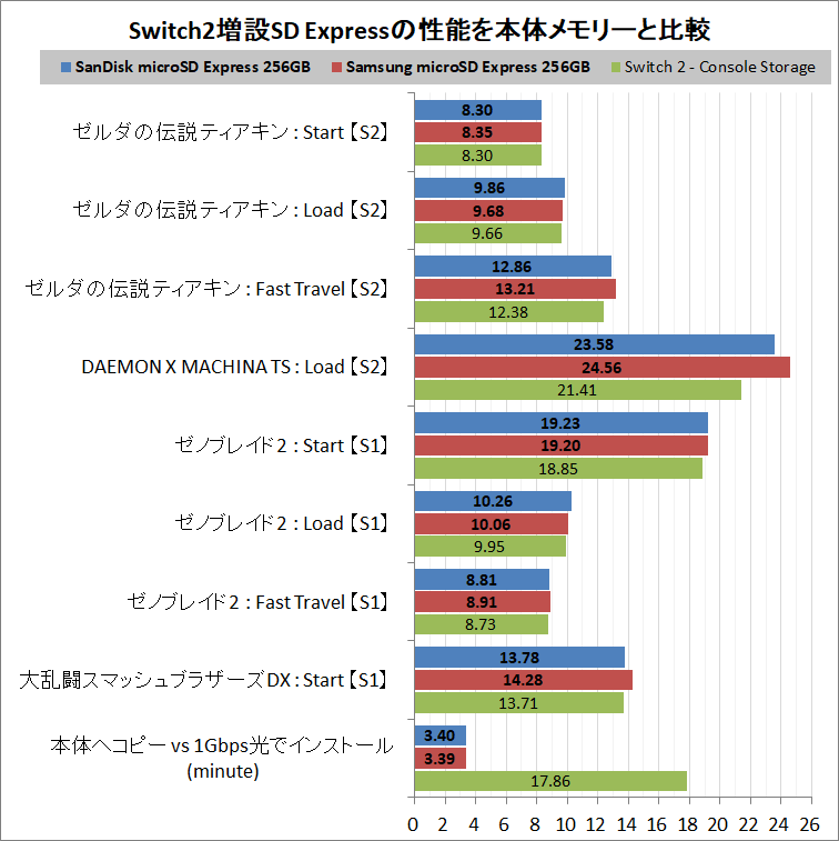 「SanDisk / Samsung microSD Express Card 256GB for Nintendo Switch 2」をSwitch 2の増設ストレージとして使用した時のゲームロードやコピーインストールの性能を本体内蔵メモリーと比較すると次のようになっています。