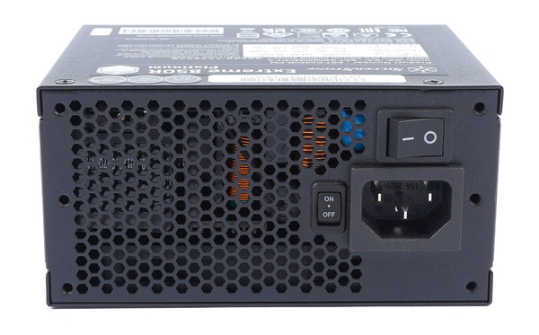 ACコンセントケーブルは国内のPC関連でよく使われる3PINタイプの端子になっています。コンセントからの電力供給を簡単にカットできるロッカー型ハードウェアスイッチが付いています。排気用の背面エアスリットもほぼ全体に及び大きく取られているので通気性も十分です。