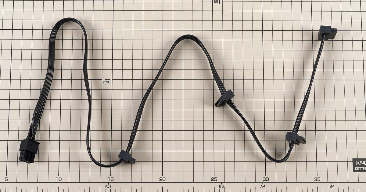 SATA電源ケーブルは全長700mm(300 + 200 + 100 + 100mm)で4コネクタのケーブルが2本付属します。