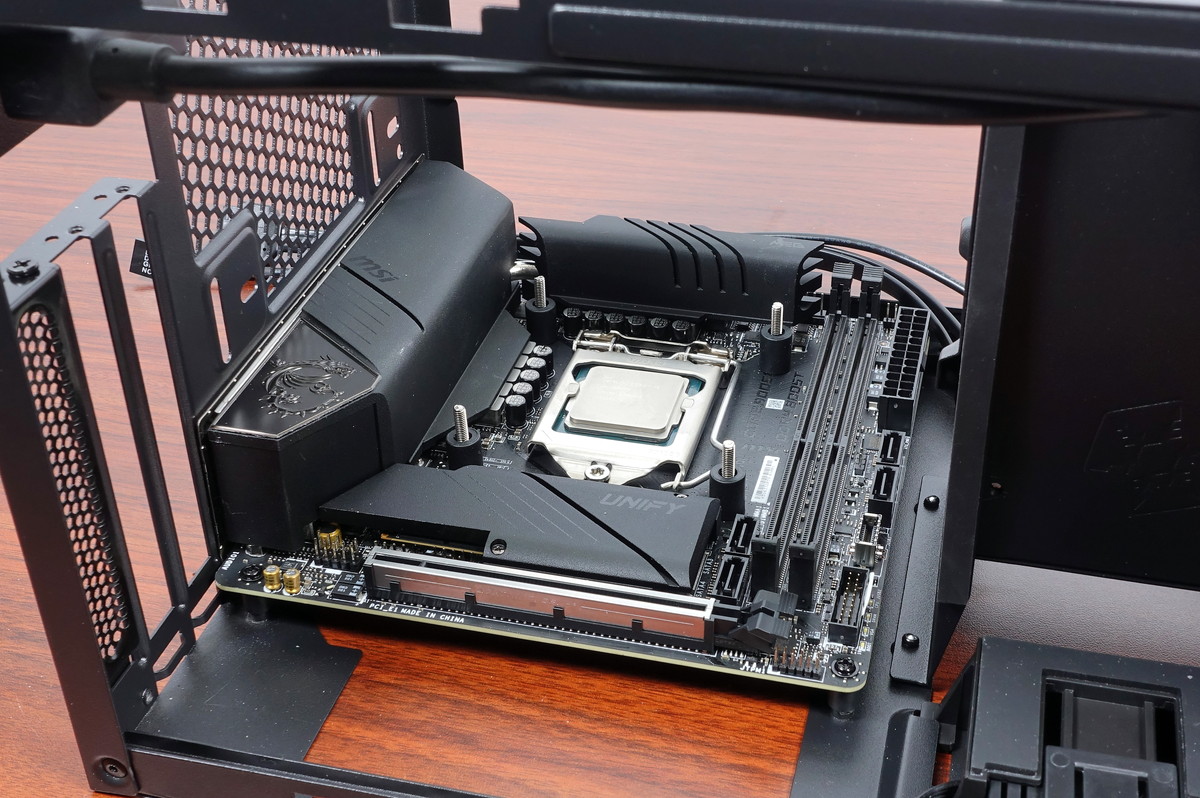 内部についてさらに少し詳しくチェックしていくため「SilverStone SUGO 14」にMini-ITXマザーボードを設置してみました。「SilverStone SUGO 14」はMini-ITX対応PCケースなので、当然ですがMini-ITXマザーボードを問題なく設置できます。