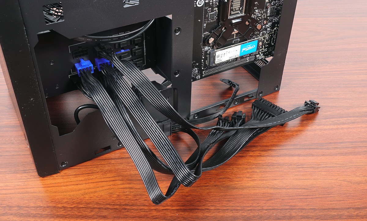 「SilverStone SUGO 14」ではPCケース前方に電源ユニットの設置スペースがあり、延長ケーブルを介してPCケース後方でACケーブルを接続する構造です。