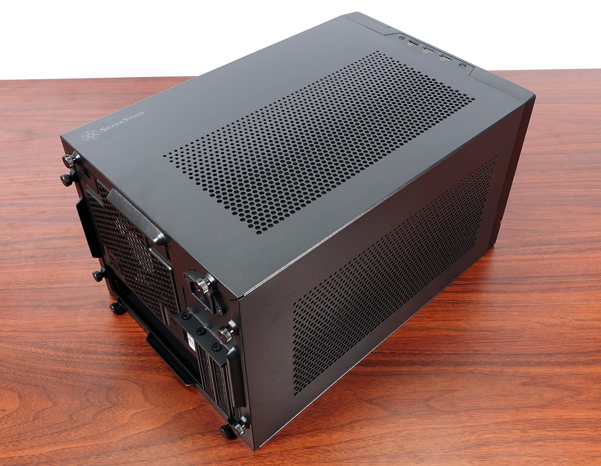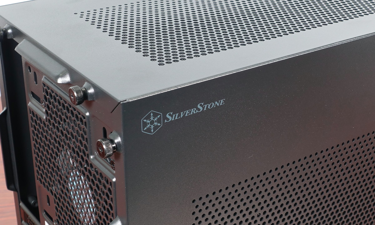外装パネルはシンプルな黒塗装で、前方から後方に向かって徐々に大きくなるヘックス型エアスリットを除けば特長もありませんが、横置き時の左側後方には小さくSilverStoneのロゴが描かれています。