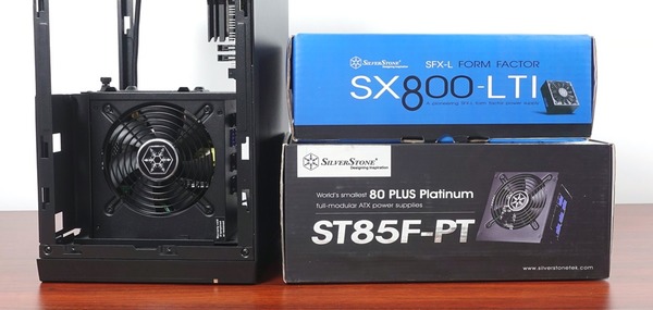 続いて「SilverStone SUGO 14」にSFX-Lサイズ電源ユニットを組み込んだ場合のクリアランスをチェックしていきます。検証機材には奥行130mmの同社製SFX-Lサイズ電源ユニット「SilverStone SX800-LTI」を使用します。