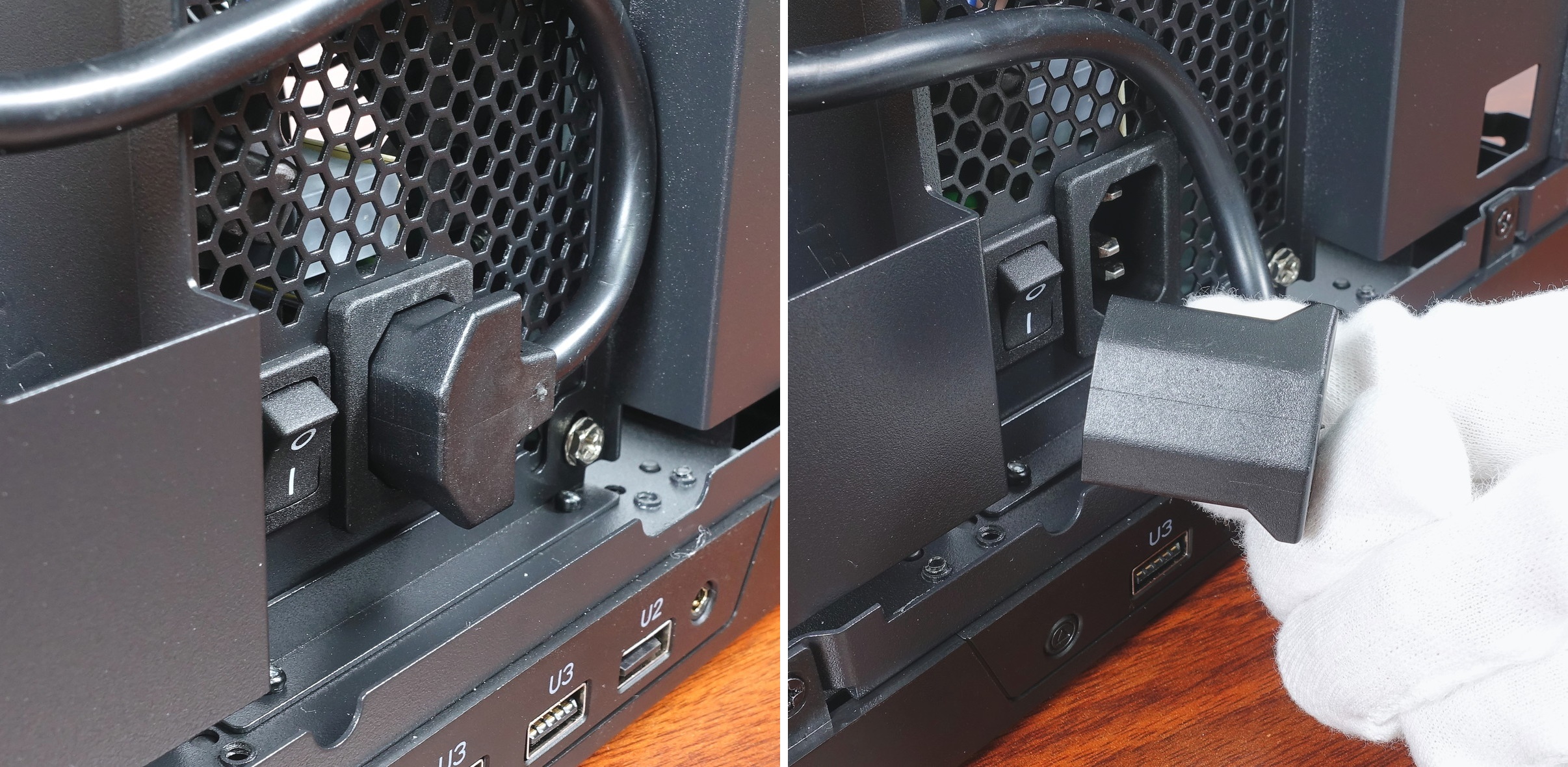 「SilverStone SX800-LTI」は基本的に問題ないのですが、1つだけ注意点として、AC延長ケーブルのコネクタがロッカースイッチに被さってしまいます。ON/OFFを勝手に切り替えてしまうほどではないのですが、微妙に接触があるので、少し注意が必要かもしれません。