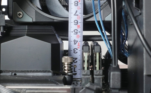 マザーボードの上(右サイドパネル側)に、CPUクーラーがはみ出していいサイズが6mmまでというのも仕様通りです。
