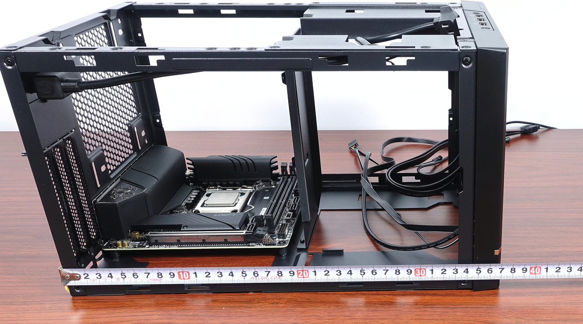 マザーボード右端と、その右隣にある隔壁との間隔は10mm程度となっており、Mini-ITXマザーボードでは採用が少ないですが、マザーボードと平行なSATA端子や、内部USB端子の変換でL字になる基板等は干渉に注意が必要です。