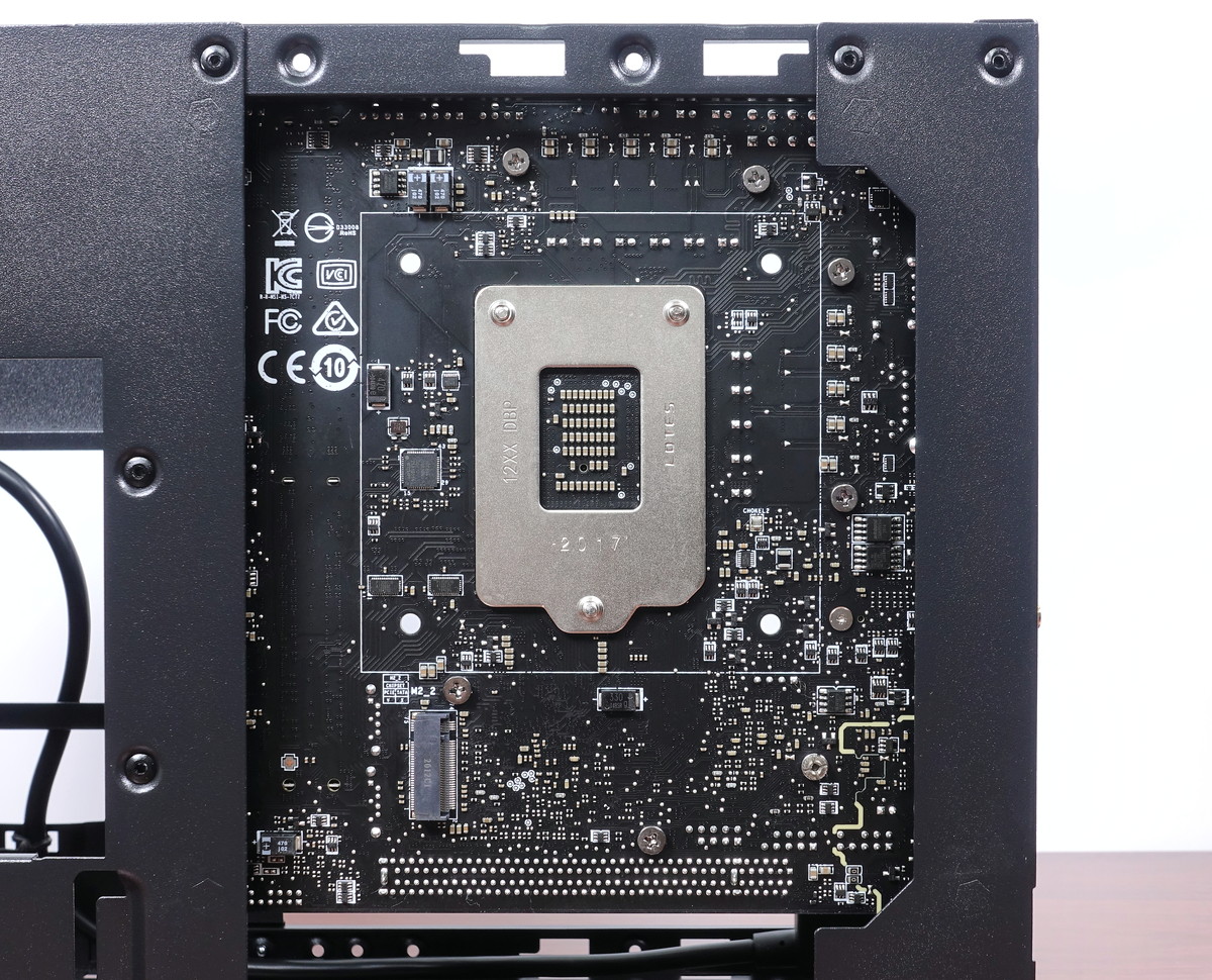 マザーボードを装着した状態で「SilverStone SUGO 14」のマザーボードトレイ裏側を見ると次のようになっています。マザーボードの裏側にはシャーシ上にはCPUクーラーメンテナンスホールとしてほぼ全面に近い開口が設けられています。