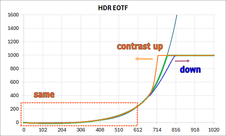 HDR表示においてコントラストの設定を上げると、一般的に200~300cd/m^2程度のSDR輝度域を超える高輝度において、ガンマカーブが左にシフトし、コードバリューに対して実際に表示される輝度が高くなります。