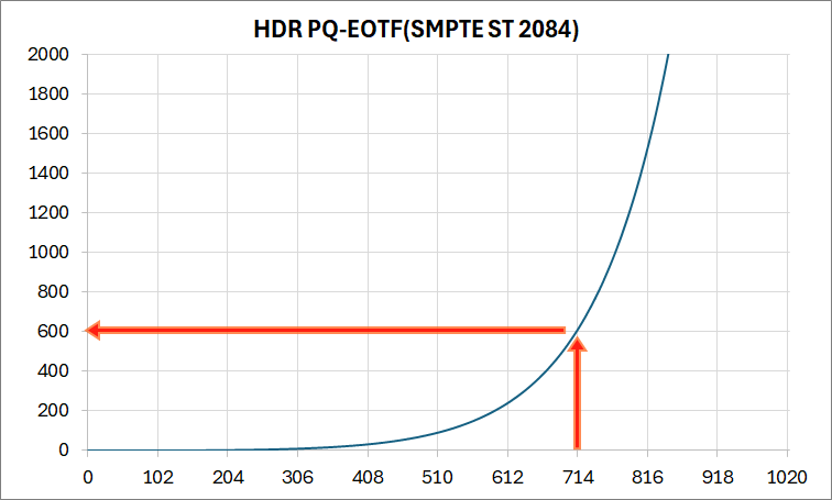 1024段階のコードバリューのうち、0~714まではPQ-EOTFに従って輝度階調を表現しますが、800など600cd/m^2を超えるコードバリューが指定されても、現実には600cd/m^2しか発揮できません。