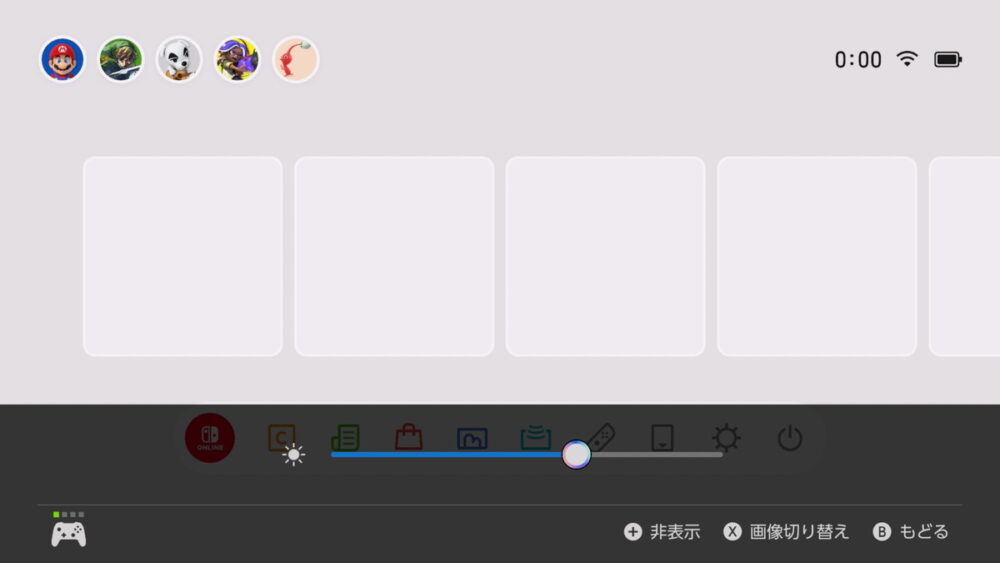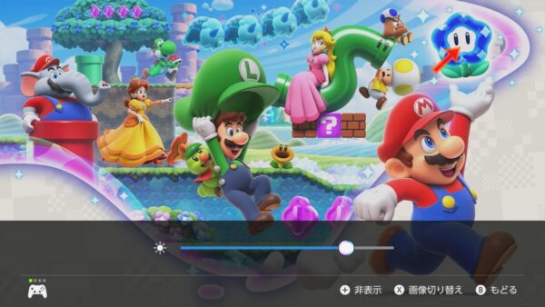 一方で、フラワーの中心が300cd/m^2程度になるように明るさスライダーを調整すると、Switch 2のホーム画面の白色も300cd/m^2程度になります。ゲーム内でもUIの輝度が300cd/m^2程度になります。