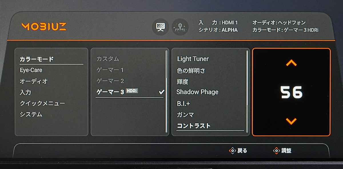 SDR表示だと基本的に触らない設定ですが「コントラスト」を使用します。