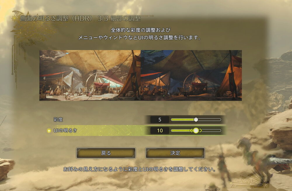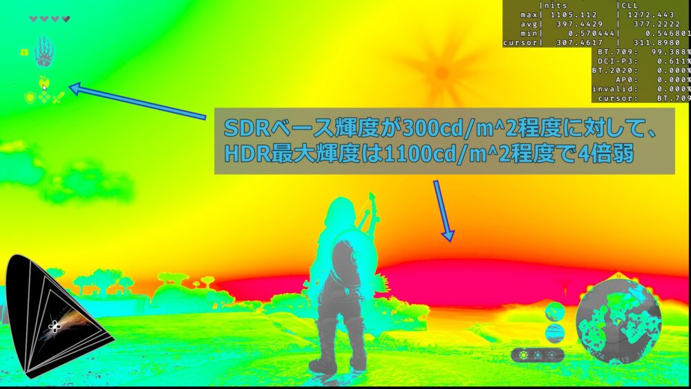 SDRベース輝度はUI等に使用される白色(HDRペーパーホワイト)なので、つまりゲームをプレイしていて目が慣れる明るさです。
