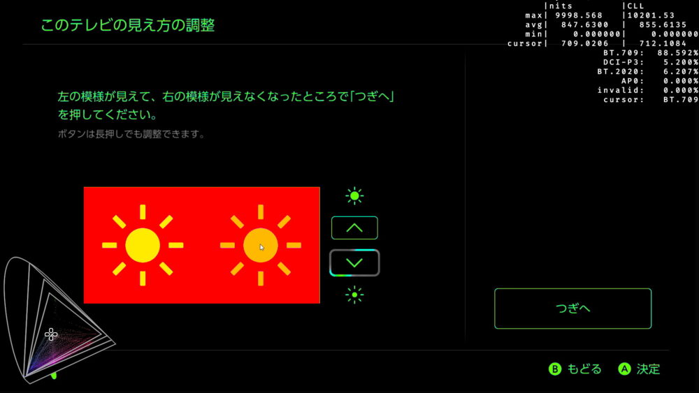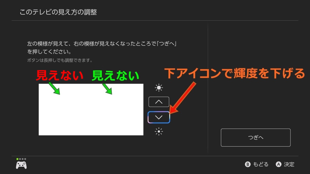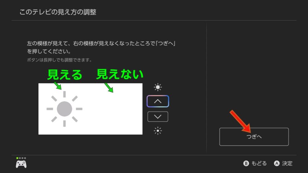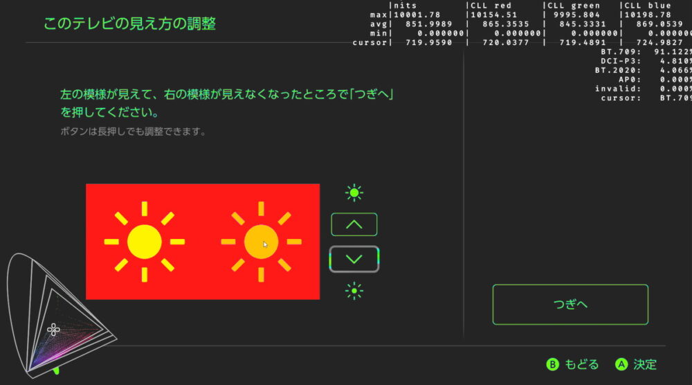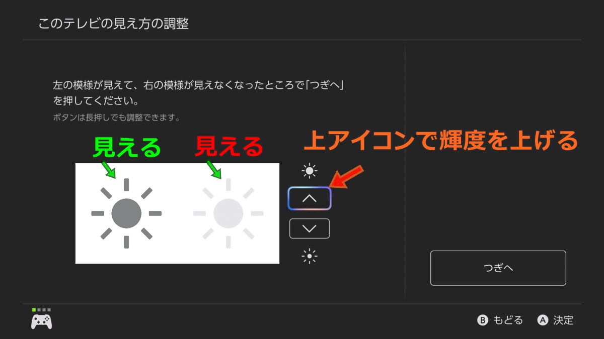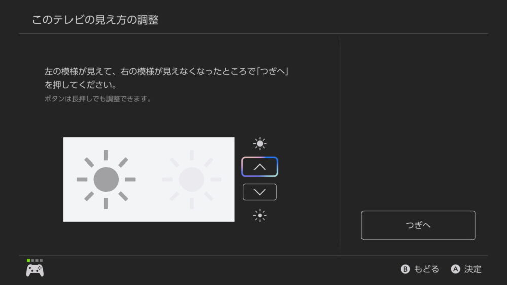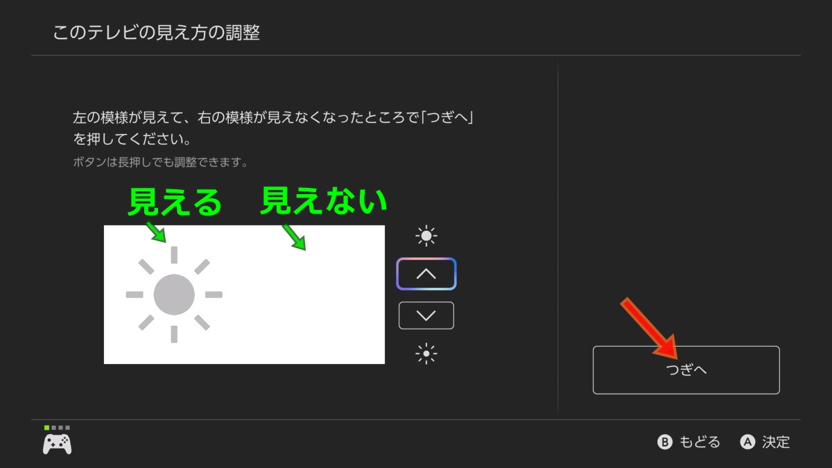 設定方法自体はガイドの通り、左側の太陽マークが見えて、右側の太陽マークが見えなくなるように上下アイコンで明るさを調整します。