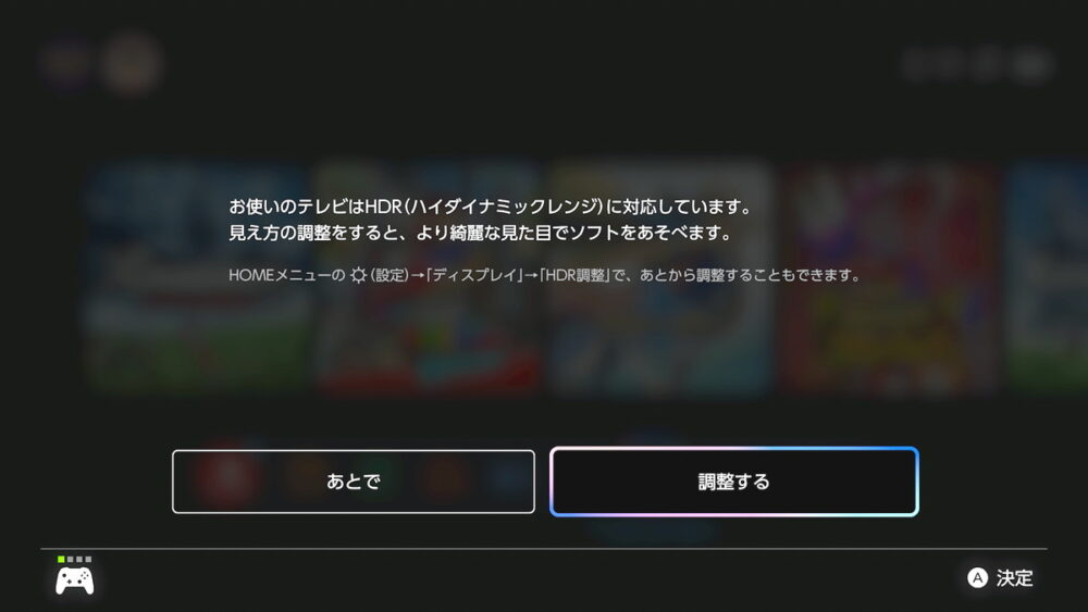 Nintendo Switch 2をドック経由で新しいテレビやゲーミングモニタに接続した時、そのディスプレイ機器がHDRに対応していると、最初にHDR調整のガイドが表示されます。