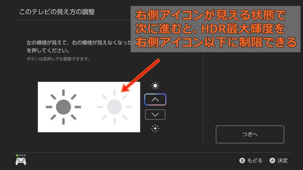 ちなみに2つ目の設定を正しく設定しても、HDR表示で最大輝度が眩し過ぎる、という場合は、あえて1つ目の設定において右側アイコンが見える状態で次に進むことで、右側アイコンよりもHDR最大輝度が明るくならないように制限できます。