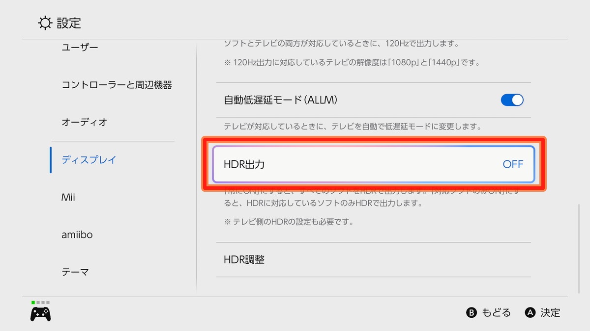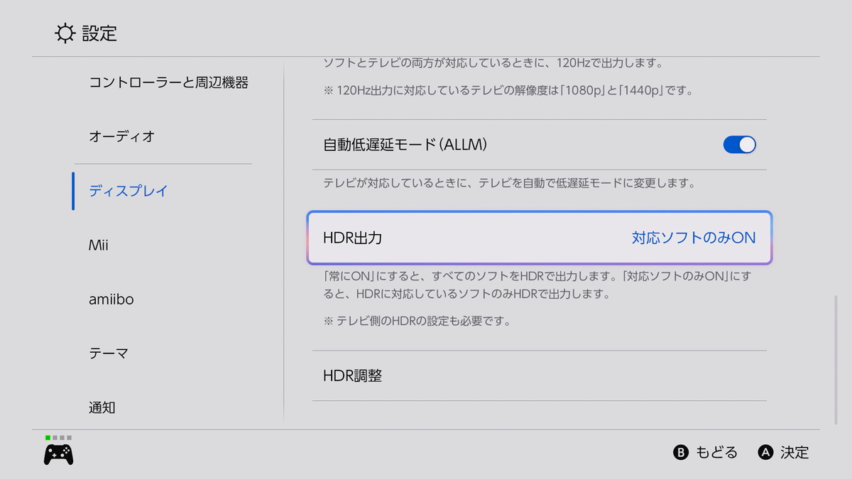 HDR有効でSDRゲームを起動するとsRGBカラーがそのまま表示されてしまうので、HDRに非対応のゲームをプレイする場合はHDRをオフにした方が良いです。Switch 2のHDR設定には『対応ソフトのみON』があるので、これを選んでください。