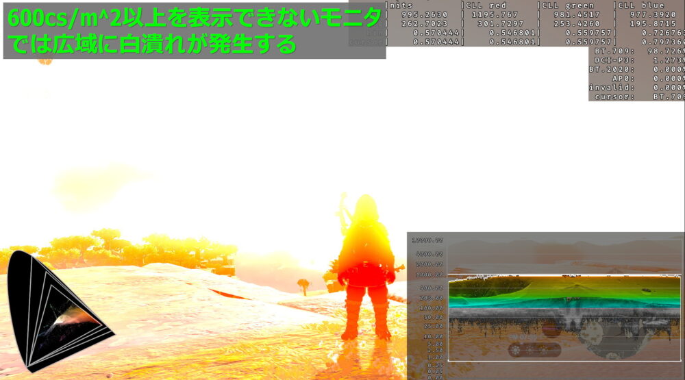 こういうモニタに対して600cd/m^2を超えるコードバリューを使用した映像データを送っても、高輝度階調は再現できず、600cd/m^2の最大輝度で白潰れしてしまいます。