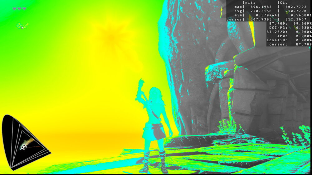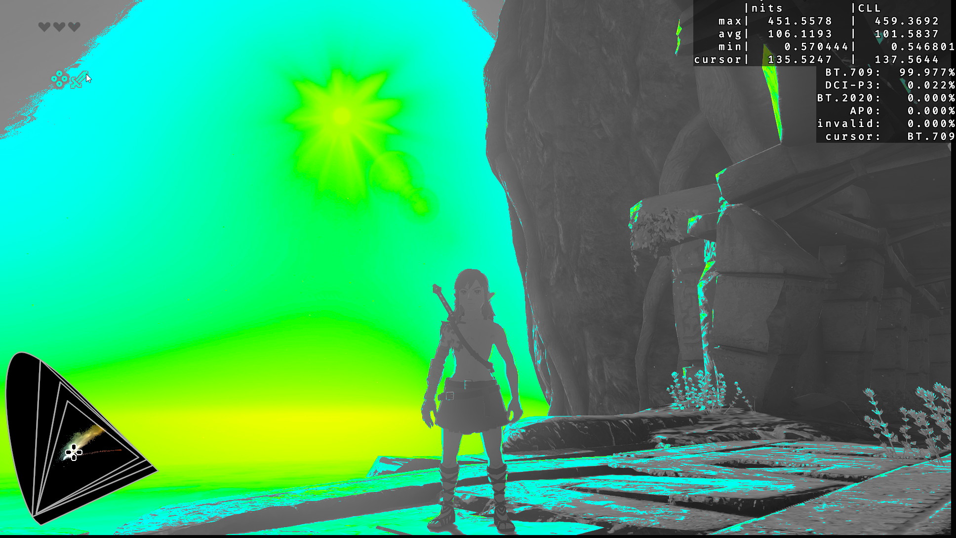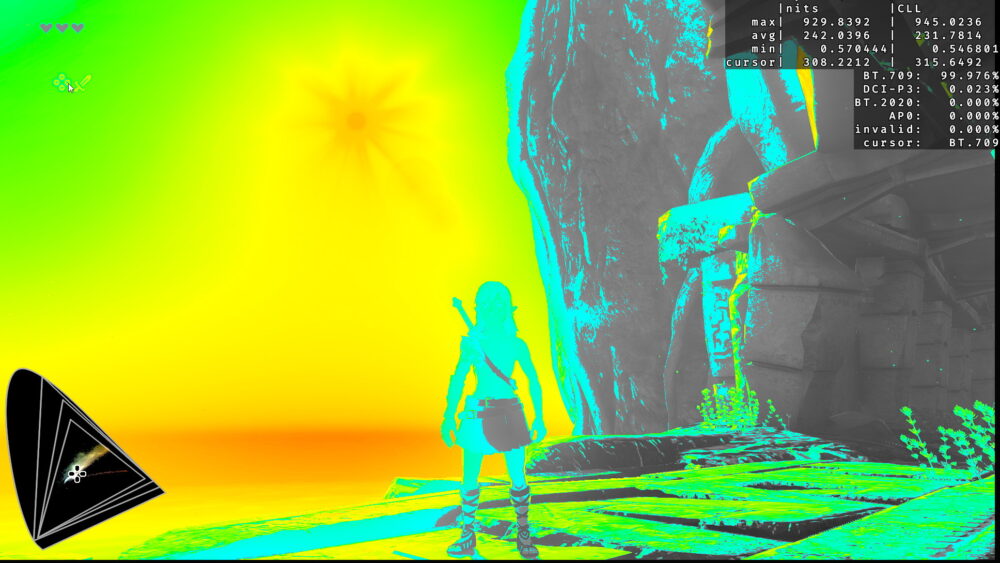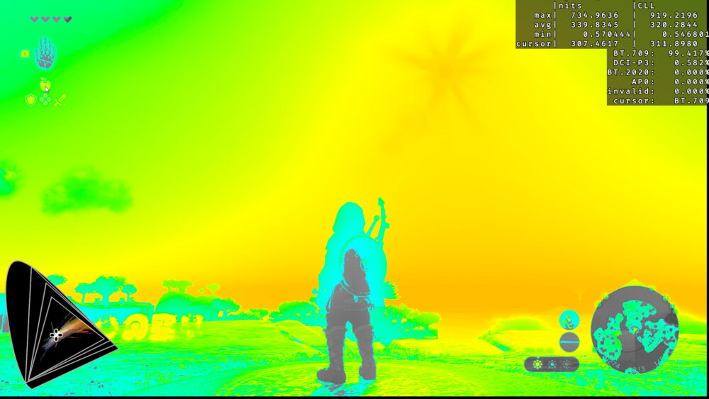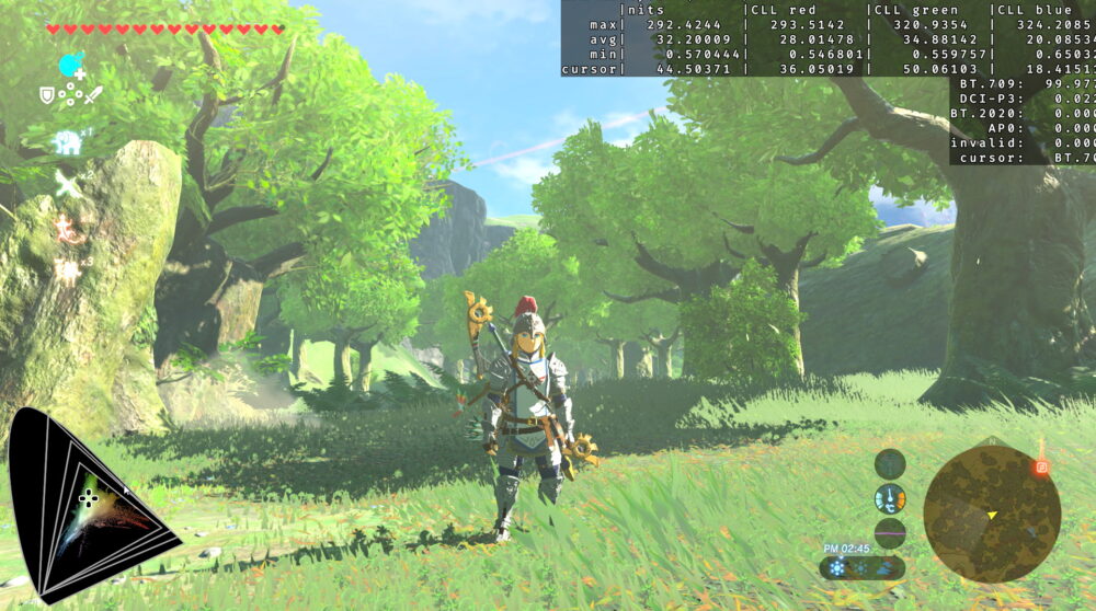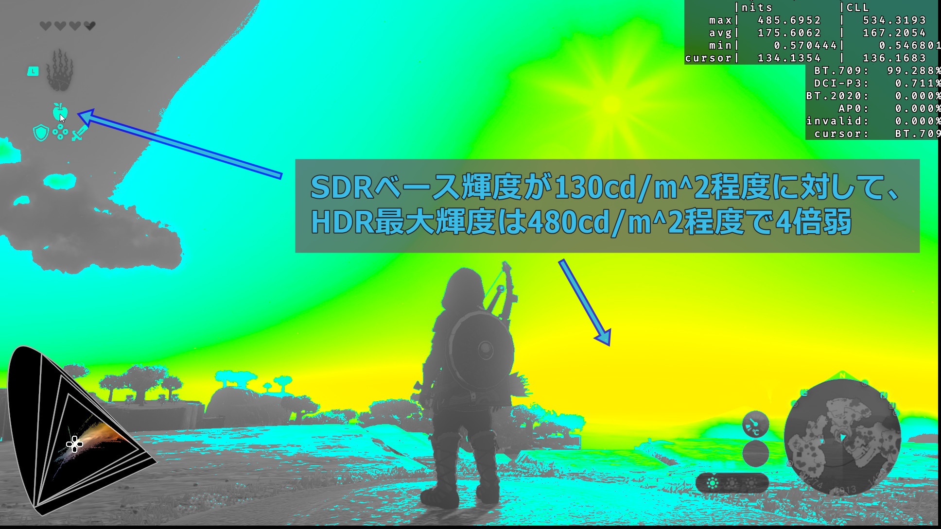 Nintendo Switch 2の場合、ゼルダの伝説 ブレワイとティアキンがHDR対応なのに広色域カラーを全く使わないゲームでした。(多分、初代SwitchのSDR環境向けで作られたタイトルだから、テクスチャとか素材がsRGBなんだと思う)