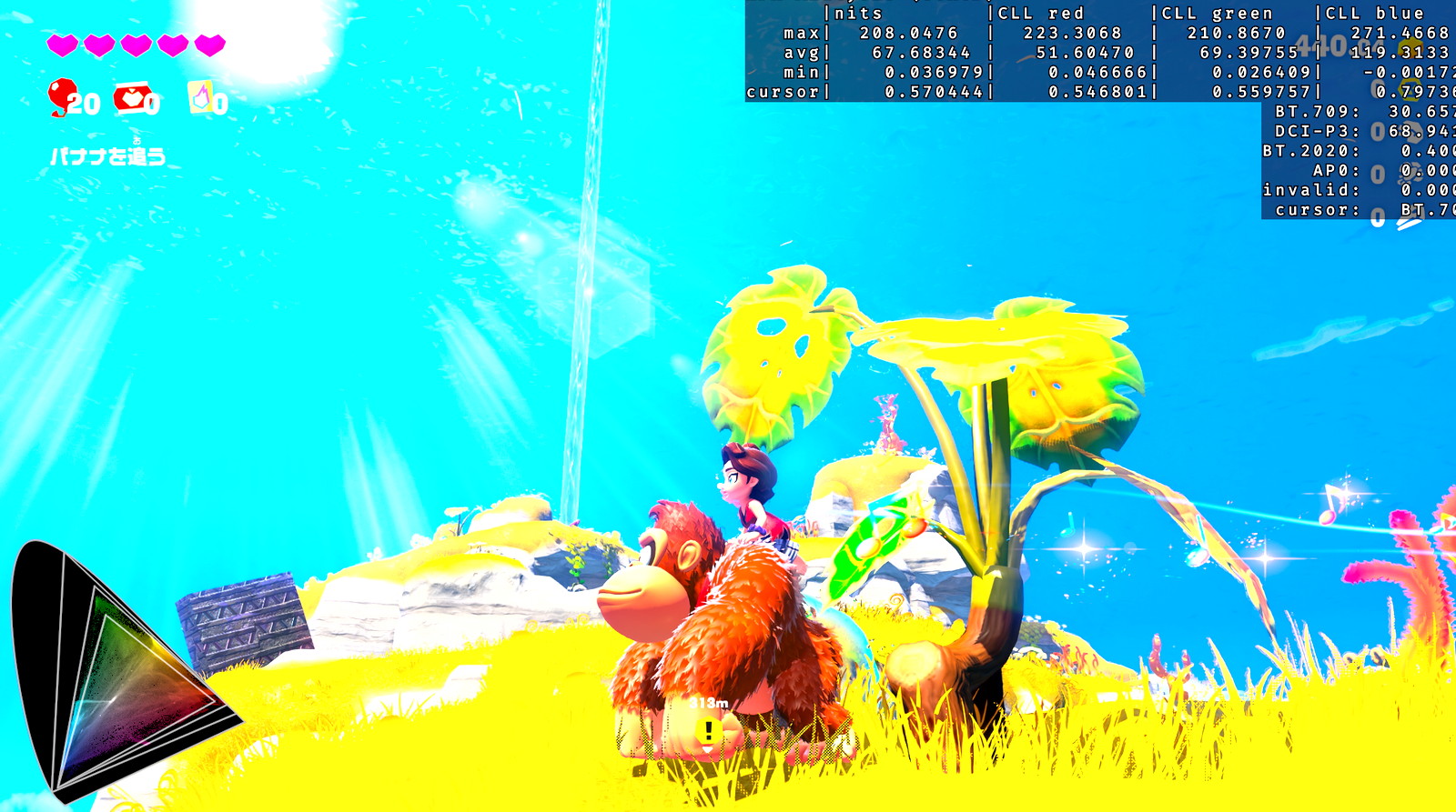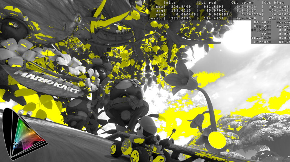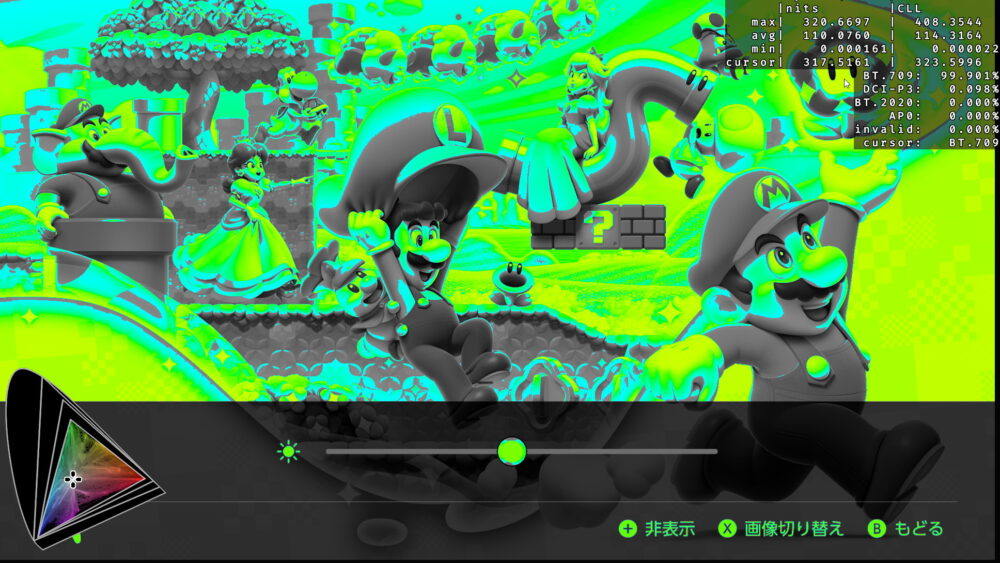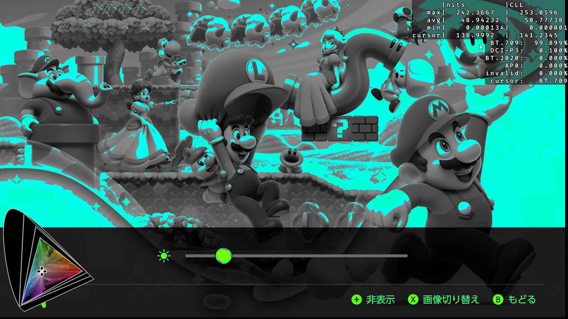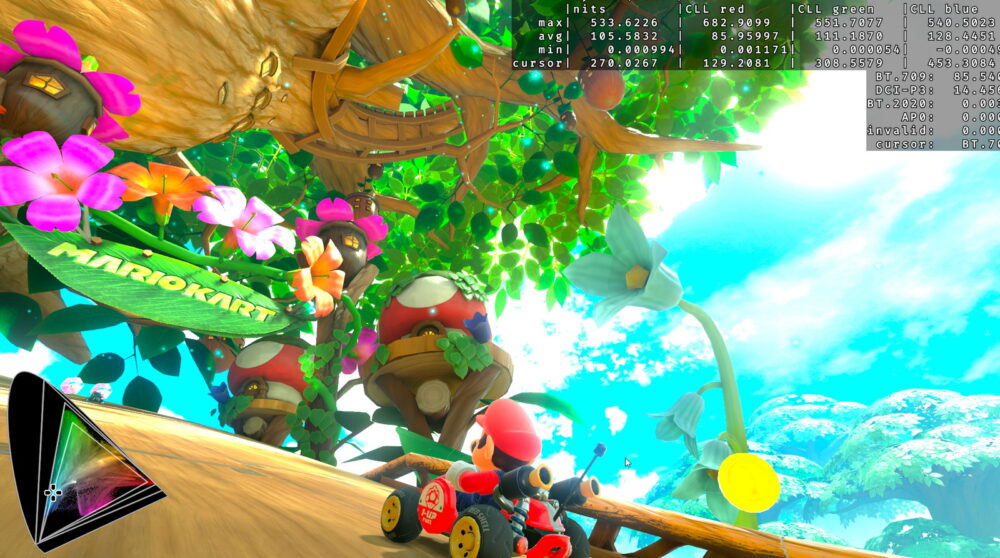 マリオカート ワールドやドンキーコング バナンザはTVモードでもしっかりとDCI-P3の広色域カラーを使用していたので、今後の任天堂純正タイトルについては大丈夫だと思いますが…。一方でサードパーティ製タイトルがHDRに対応した時にちゃんと広色域カラーを使用してくれるかどうかが不安です。