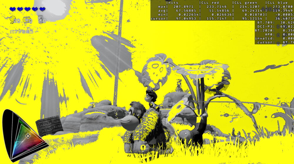 サンプルイメージの1つ、マリオが掲げているフラワーの中心部はほぼSDR白色になっているので、これを基準に調整して、その後の輝度ヒートマップを見ていくと、SDRベース輝度の設定で映像がどう変わるのか一目瞭然です。