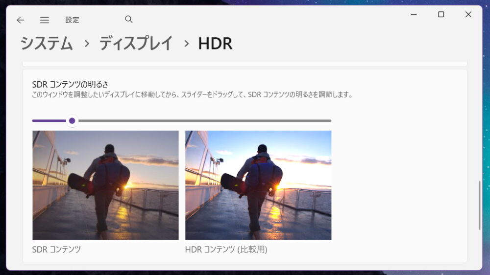 ちなみに上の例ではSDRベース輝度を300cd/m^2程度にした場合、HDR最大輝度は900cd/m^2程度になりますが、1つ目のHDR調整において、右側の太陽アイコンが消える前に次のステップに進むと、右側の太陽アイコンの明るさにHDR最大輝度をさらに制限できます。