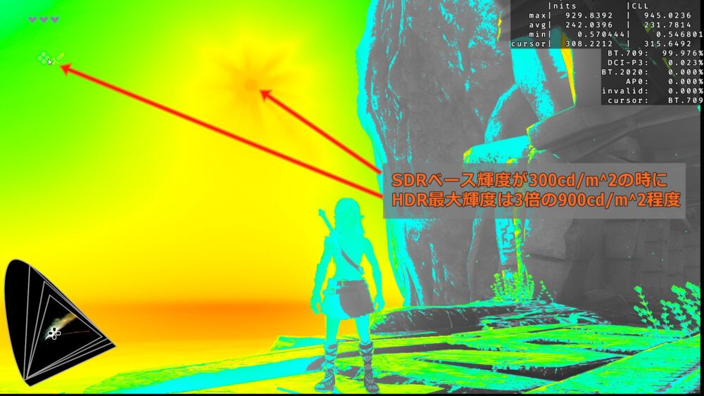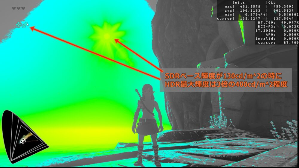 Nintendo Switch 2のTVモードはHDR調整の1つ目でHDR最大輝度を設定するので、その範囲内で最大限に高輝度を使用するかと思いきや、SDRベース輝度の3倍までしかHDR最大輝度として使用しません。