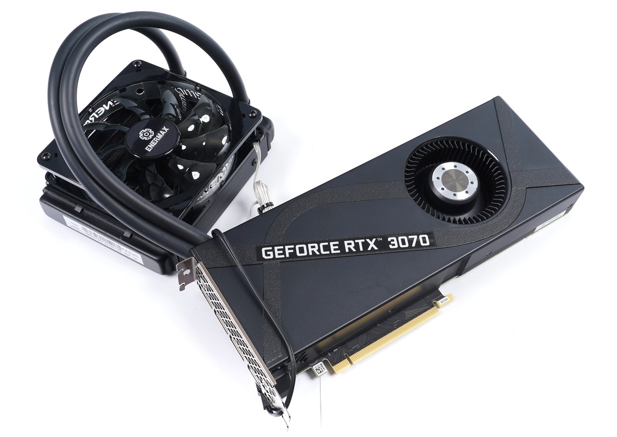 「G-Master Hydro Z590」には、サイコムがAsetek製AIO水冷クーラー「Asetek 740GN」を使用して独自に水冷化を施した専用グラフィックボードが採用されています。今回のサンプル機では外排気ブロアーファンGPUクーラーを搭載したManli製GeForce RTX 3070オリファンモデルが簡易水冷化されていました。