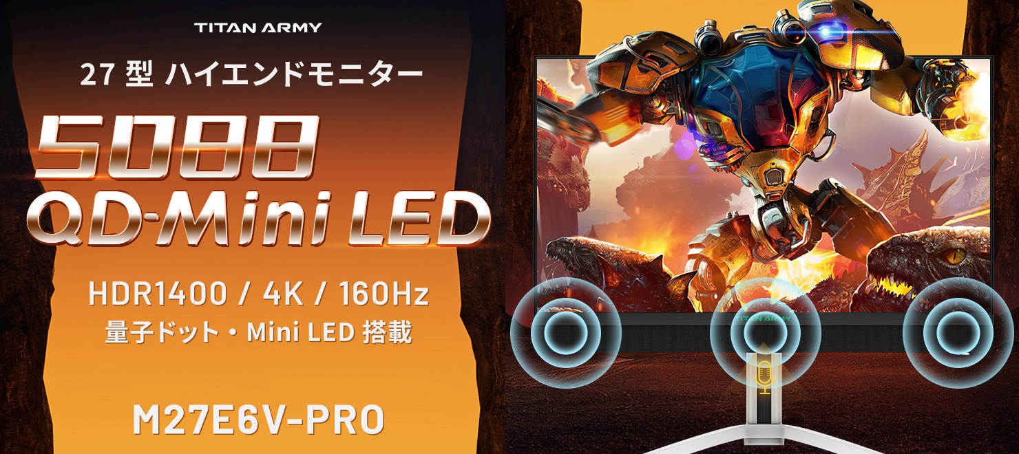 5088分割で部分駆動する直下型Mini-LEDバックライトを搭載し、最大輝度1400nits超のHDR表示やVRR同期機能に対応する、4K解像度かつ160Hzリフレッシュレートの27インチ量子ドットIPS液晶ゲーミングモニタ「Titan Army M27E6V-PRO」をレビューします。