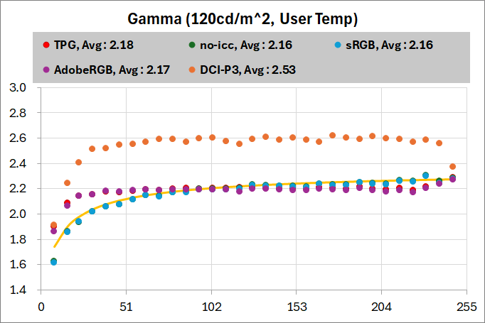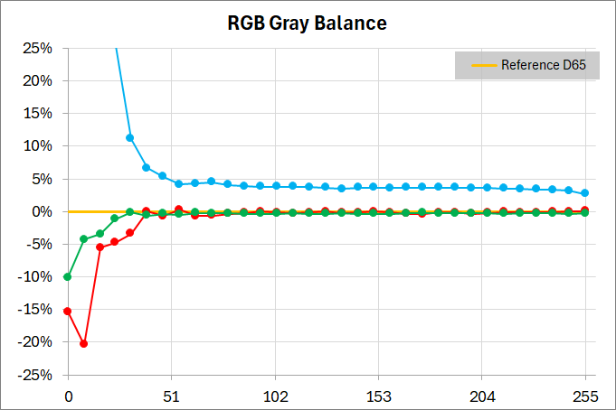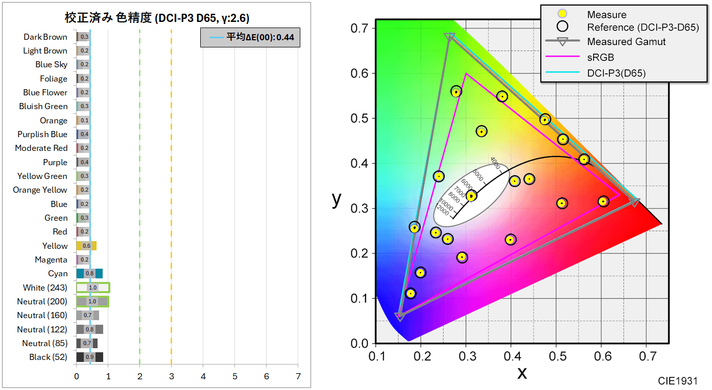 少々寒色寄りですが、目の順応に任せてD65と見なしても問題ないレベルで良く校正されていると思います。
