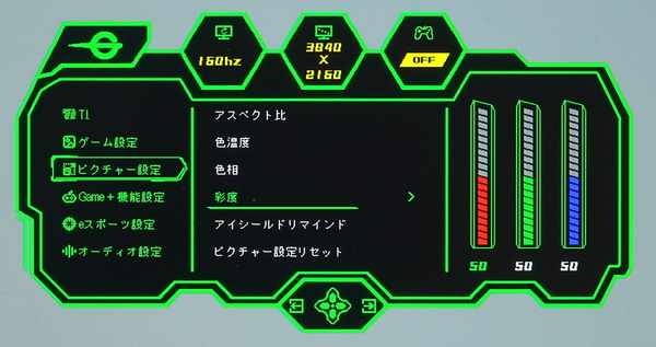 HDR対応ゲームでも実は広色域カラーを使用していないことはあるので、モニタ側で広色域カラーにプッシュできる彩度強調はゲーマーとして嬉しい機能です。ただHDRと併用できるならグレーアウト&自動設定ではなく、任意に設定値を変更できるようにして欲しかったところ。