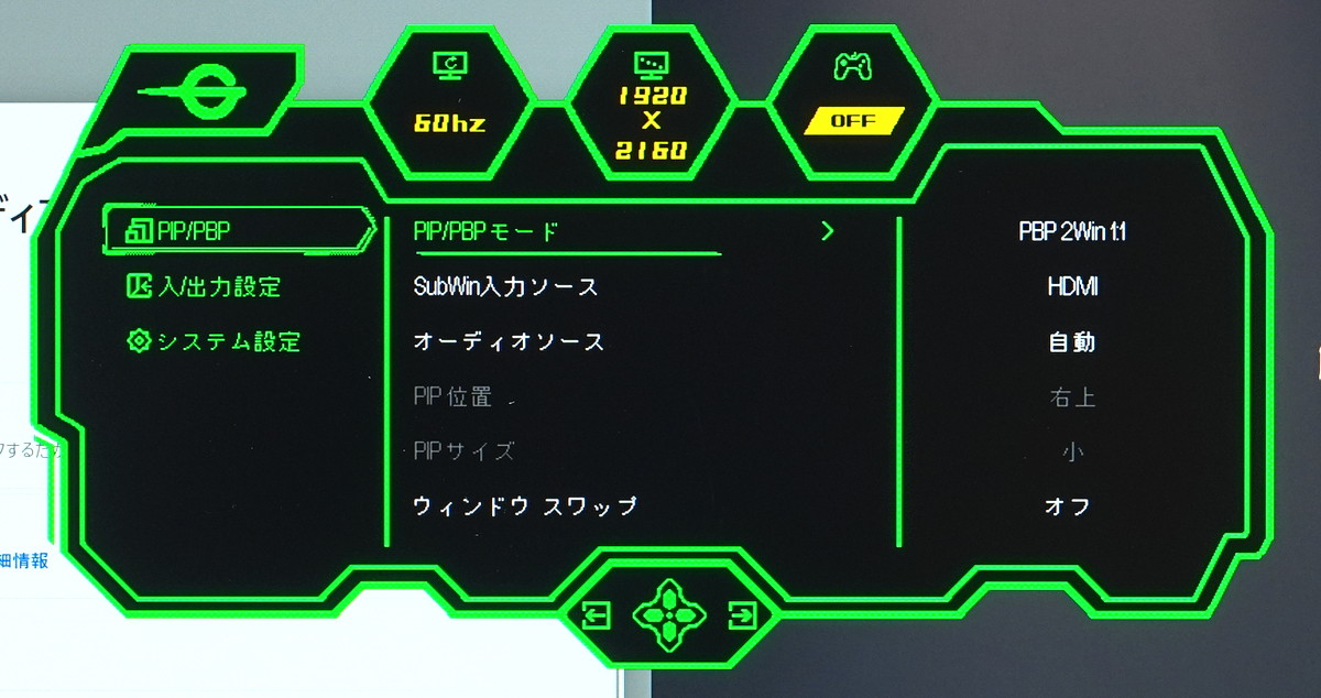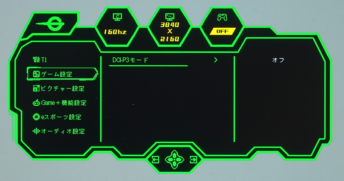 あと従来のTitan Army(INNOCN)系列のモニタは操作スイッチのハード的にもソフトウェア的にもユーザーフレンドリーとは言い難い感じだったのですが、「Titan Army M27E6V-PRO」はOSD設定周りが普通のゲーミングモニタ水準になっています。