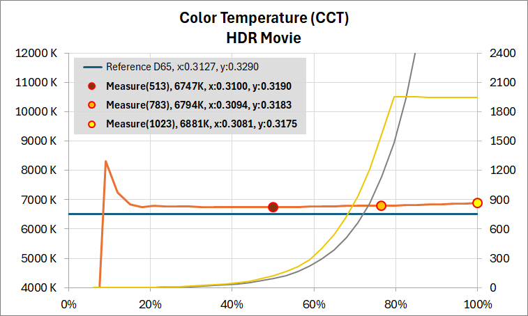先に確認したEOTFにも変なチューニングはありませんでしたし、特にHDRムービーモードは所謂、”フィルムメーカーモード”的な動作と考えていいと思います。