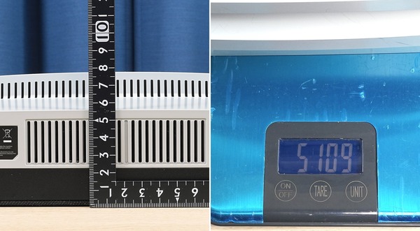 「Titan Army M27E6V-PRO」のモニタ本体の厚さは最厚部で80mm最近の液晶モニタとしては大きめですが、端の最薄部で20mm程度なので実用体感的には厚みは感じないと思います。モニタ本体重量は5.1kg程度と比較的に大きいのでモニタアームを使用する場合は耐荷重に注意が必要です。