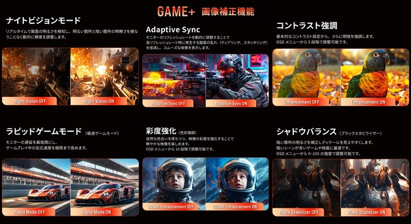 HDR表示については、実測で2000cd/m^2を余裕で上回る超高輝度と5088分割のバックライト部分駆動によって、黒が引き締まって立体感が出たり、太陽やフラッシュ・爆炎の眩しさが大迫力で感じられたりと、ゲーム体験のリアリティを向上させる意味で高い効果を感じられるはずです。