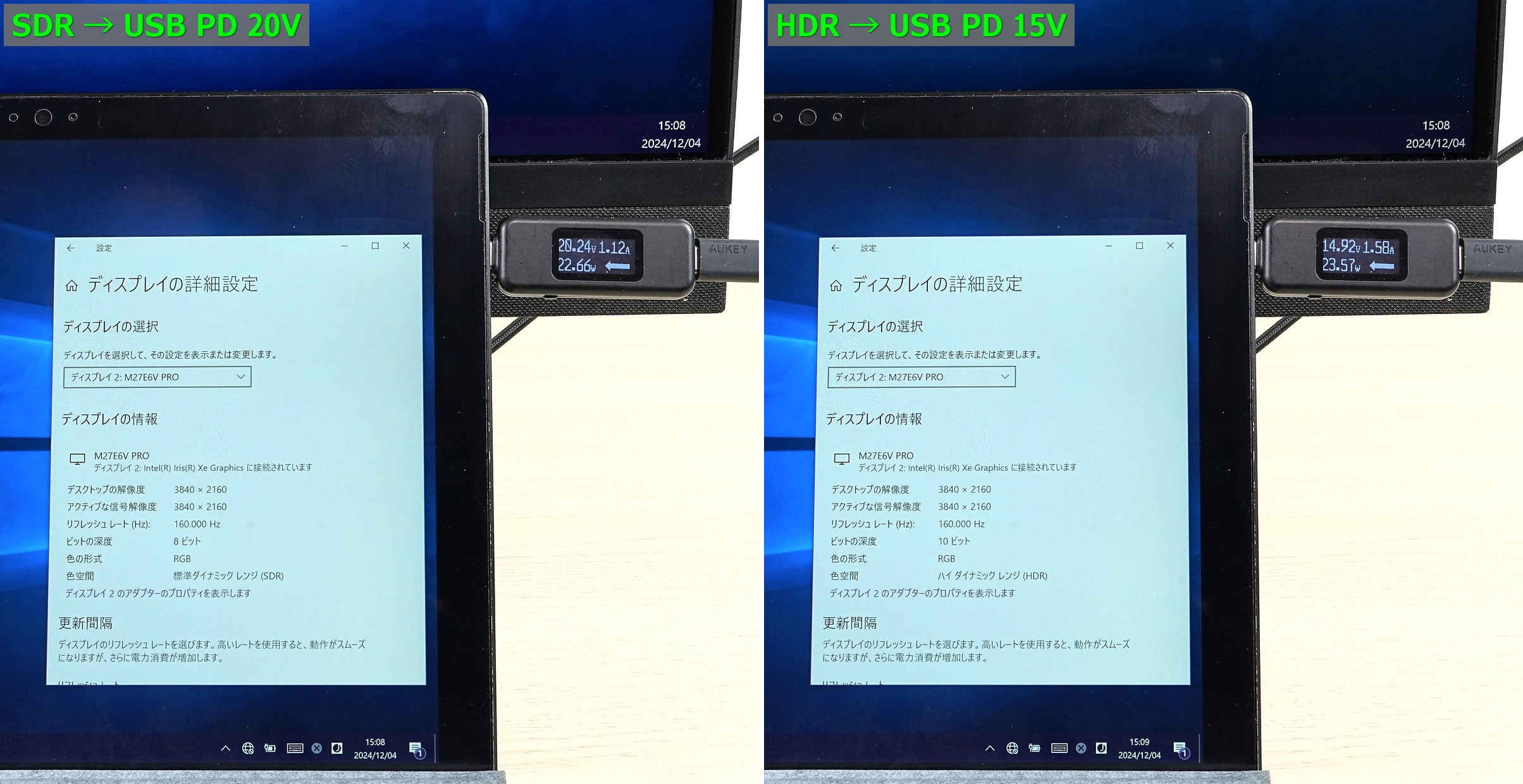 90Wなど大電力による充電に対応した機器を所有していないので、Surface Pro 7+での検証となりますが、USB Type-Cケーブルで4K/160Hzのビデオ出力を行いつつ、20V電圧で20~30Wの充電が行えることも確認できました。HDR表示の場合は20V給電はできず、15V給電になり、最大出力は45Wに制限されます。