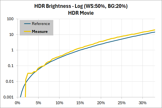 10%より小さいウィンドウサイズにおける輝度低下が50%前後、つまりHDRリファレンスの半分程度なのでかなり薄暗く感じるはずです。