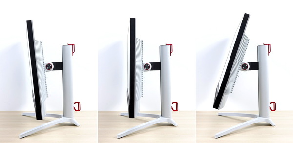 モニタの高さはモニタ本体とスタンドの付け根部分が上下に動く構造になっており、全高で445mm〜565mmの範囲内で調整できます。