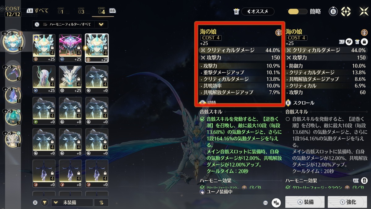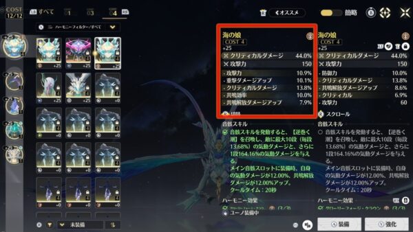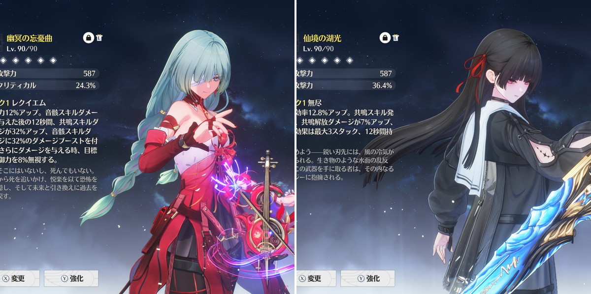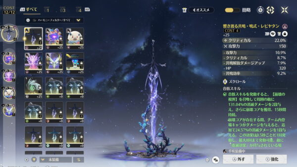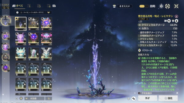 一方で恒常星5武器の仙境の湖光を組み合わせる場合は、武器効果が攻撃%アップなので、コスト4音骸のメインステータスはクリティカル率を選びます。