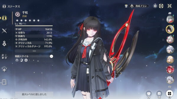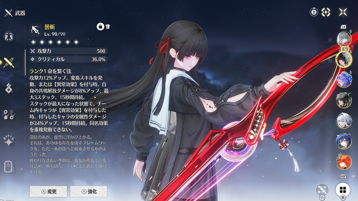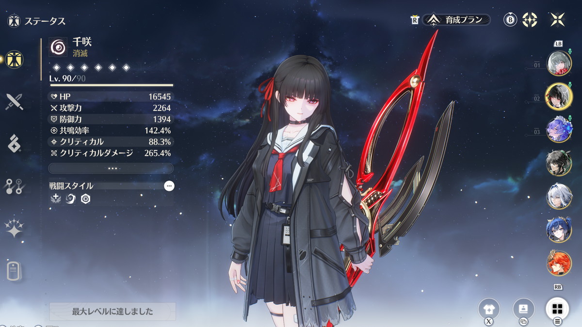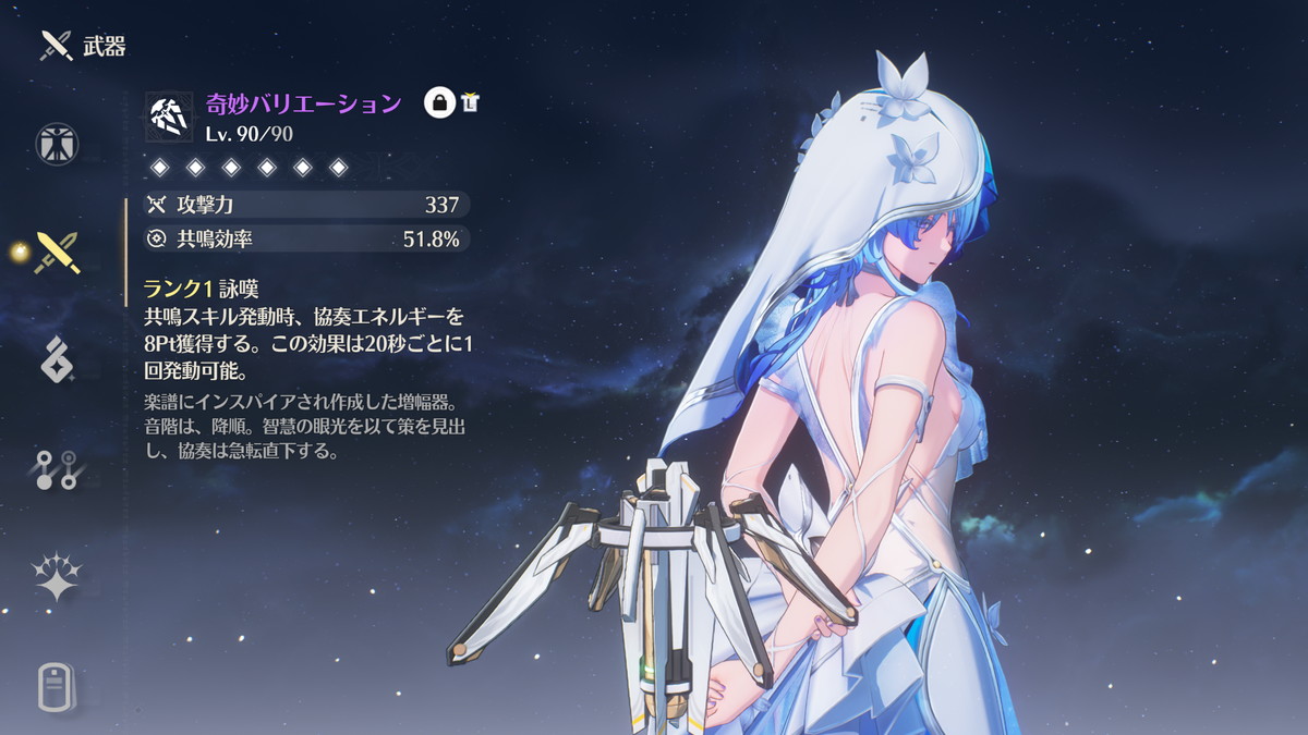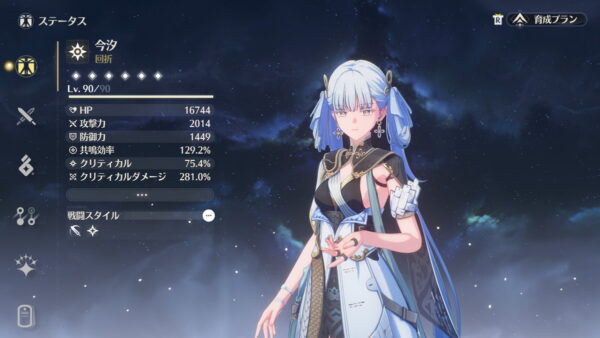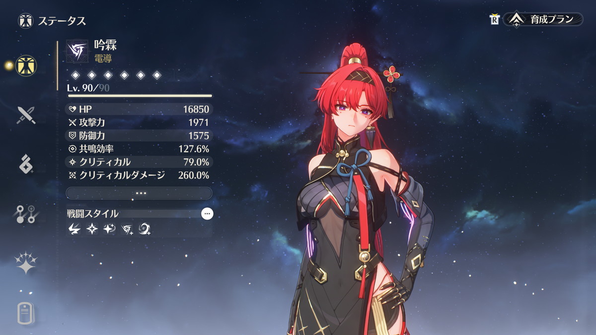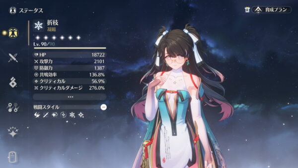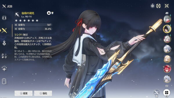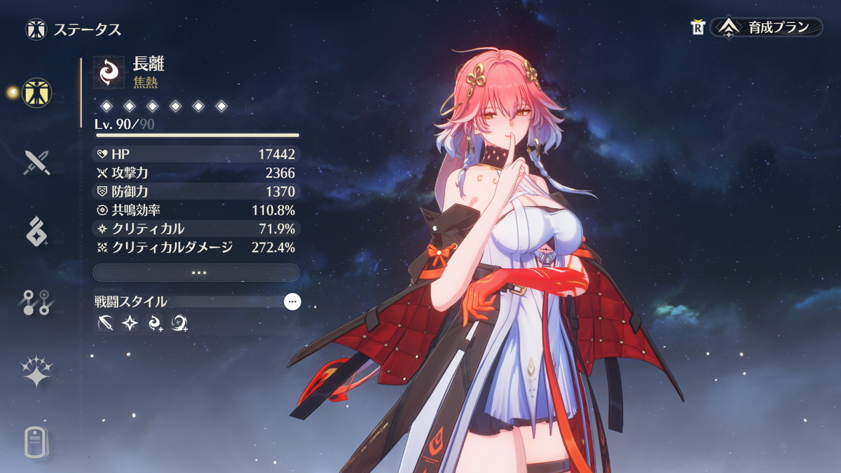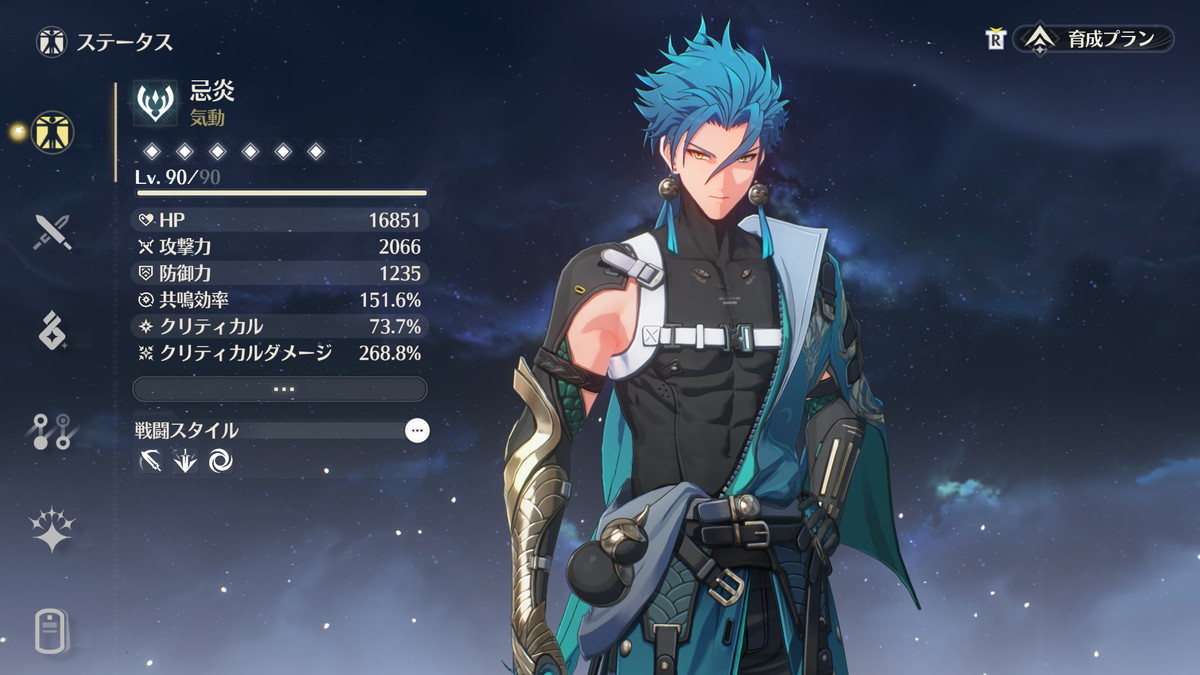 必要なステータスが共鳴効率だけ(加えてHPも高い方が良い)、モチーフ武器も必須ではないのでコスパも良いキャラです。